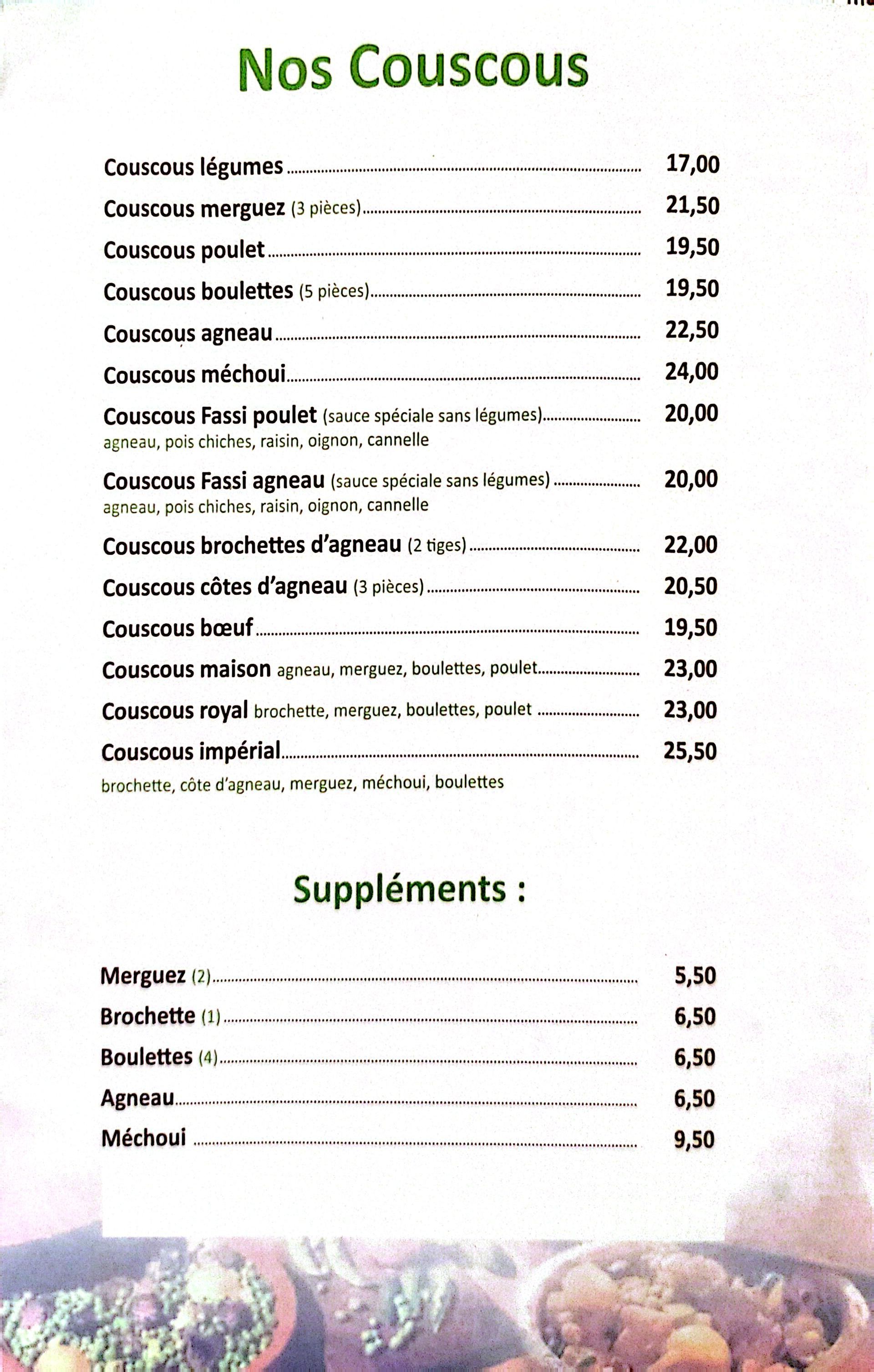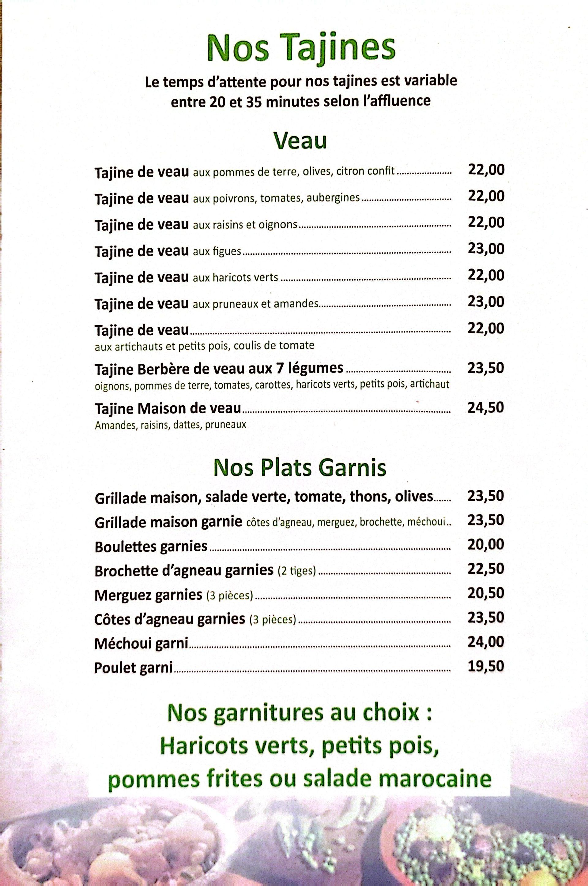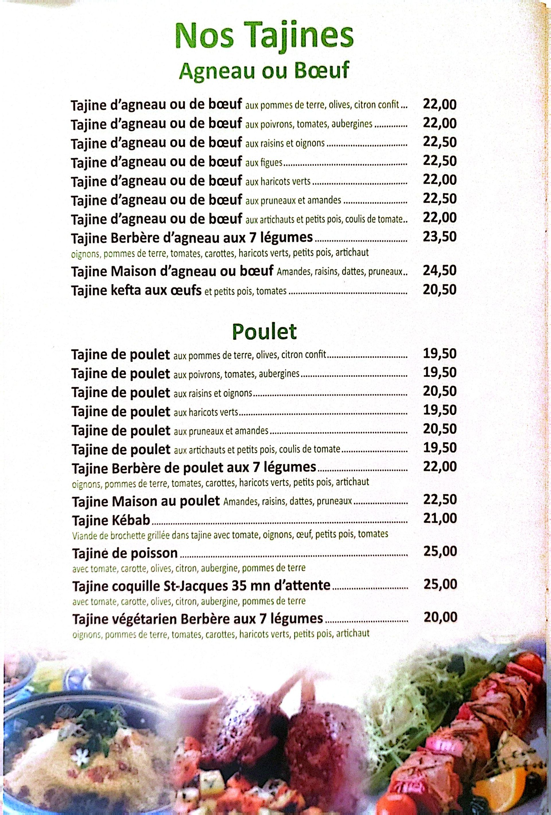 Nous proposons à la carte : tajines, couscous ou grillades.